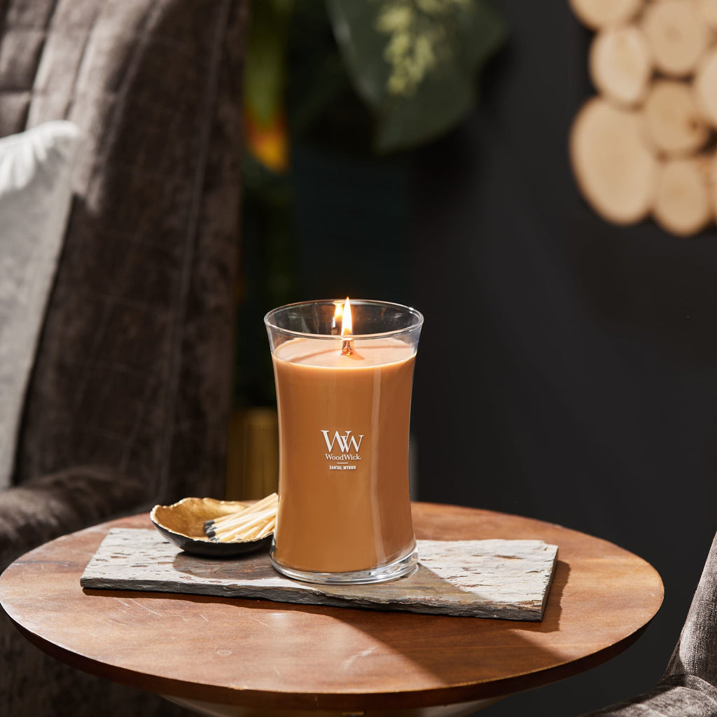 Large Hourglass Woodwick Candles fill your home with the soft crackle and inviting scents and a natural wooden wick that Crackles as it Burns. The soothing crackle of a WoodWick candle is created by a patented PLUSWICK Innovation technology, designed to ensure a safe and consistent crackle experience for faster fragrance and a better burn while fragrancing your home with the soothing sound of a crackling fire (4.0" x 7.0")