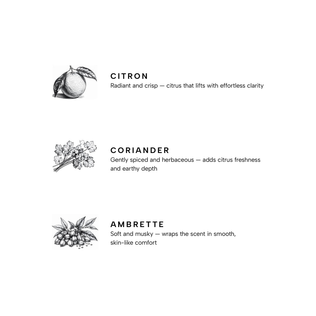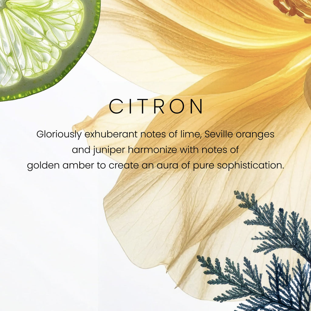 - Citron: Gloriously exuberant notes of lime, Seville orange, and juniper harmonize with notes of golden amber to create an aura of pure sophistication. Citron · Coriander · Ambrette