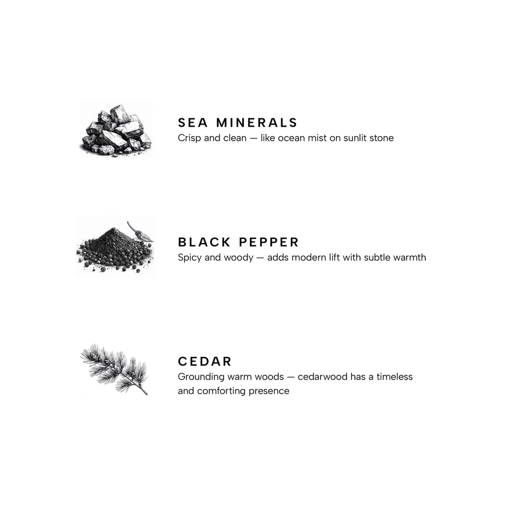 - Marine: Sea spray aloft on the breeze, cedarwood, and musk — fragrance notes of the coastal forest are flawlessly captured in this hypnotic scent for the modern home. Sea Minerals · Black Pepper · Cedar